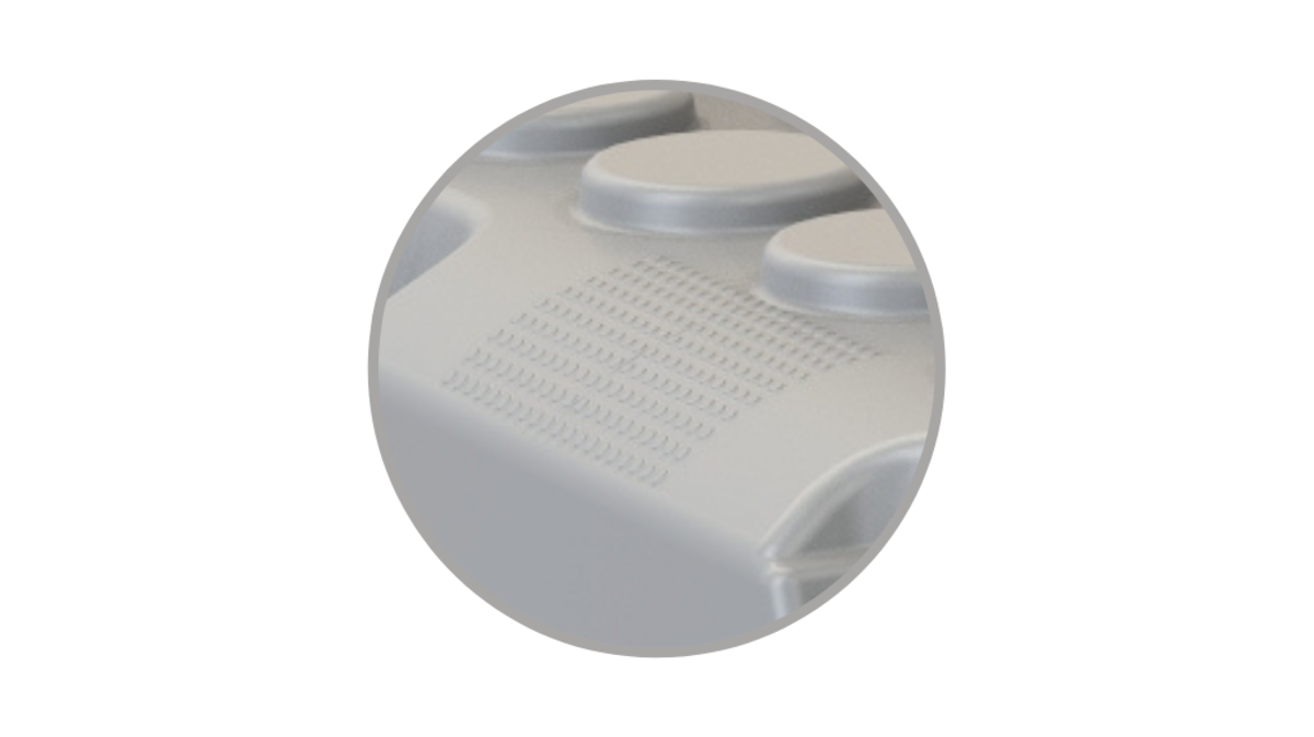 - Moulded in structural ribs for stacking strength and deformation resistance.
