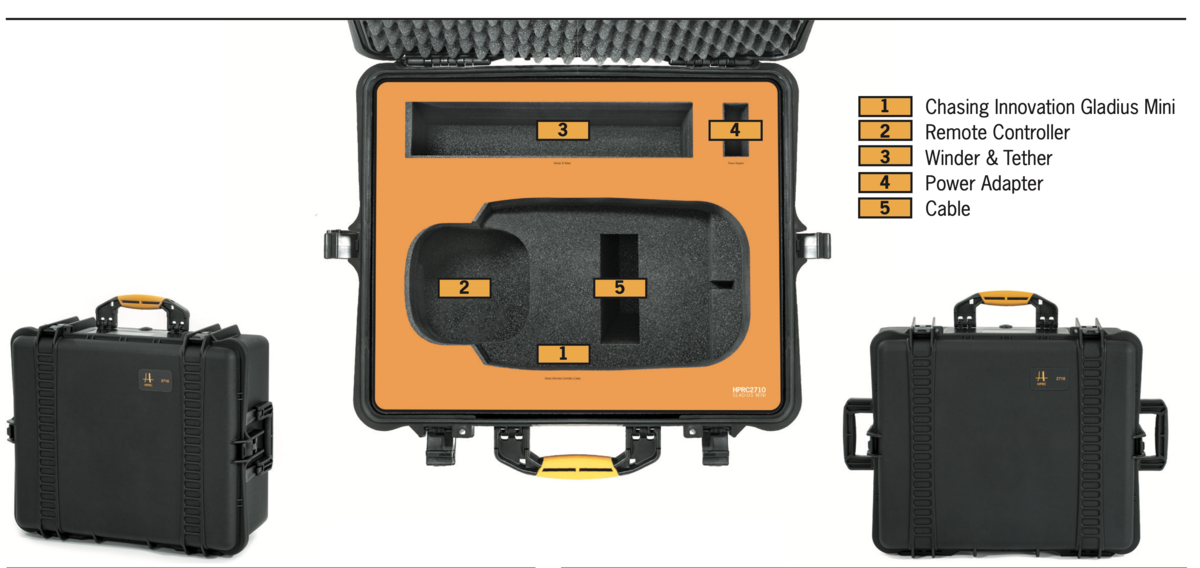 Waterlight and lightproof case, specifically designed to protect and transport the Gladius Mini, designed to contain the underwaterdrone with all its accessories. As whole HPRC range, the case is impact, drop and corrosion resistant.