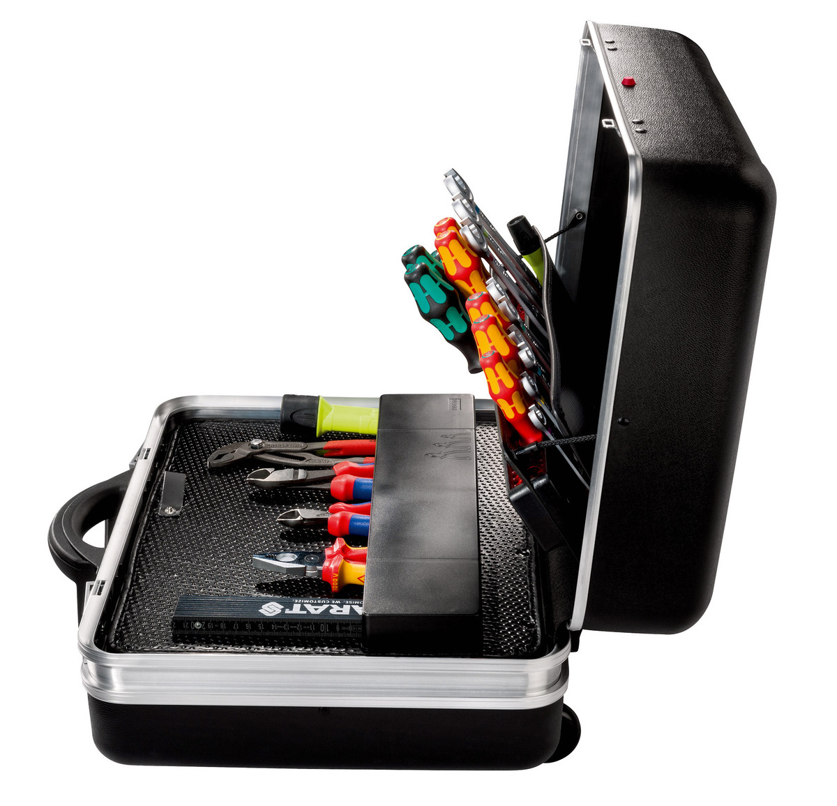 The premium tool case CLASSIC KingSize Roll Safe CP-7 wows customers as a practical trolley case with extremely large storage space for up to 60 tools. In addition, it comes with exclusive PARAT CP-7 tool holders and can be securely locked with combination locks when setting a personal code. The PARAT CP-7 tool holder impresses with its unique clamp system: tools can be flexibly pushed in and securely stowed away. Thanks to the CP-7 system, bothersome fumbling when stowing away your tools in sewn-in separators is a thing of the past. The innovative CP-7 holder securely keeps your tools in place, even overhead. Small parts or bulky tools can be stored in the generous, freely partitionable bottom tray (88 mm deep). A handy keep-safe compartment with two business card pockets plus two pencil loops is integrated in the case lid. The case body of the CLASSIC KingSize Roll Safe CP-7 is made of sturdy, anti-slip X-ABS plastic and is reinforced with an aluminum frame inside. The integrated trolley system with smooth-running wheels and telescopic handle allows easy transport of the tool case from A to B.