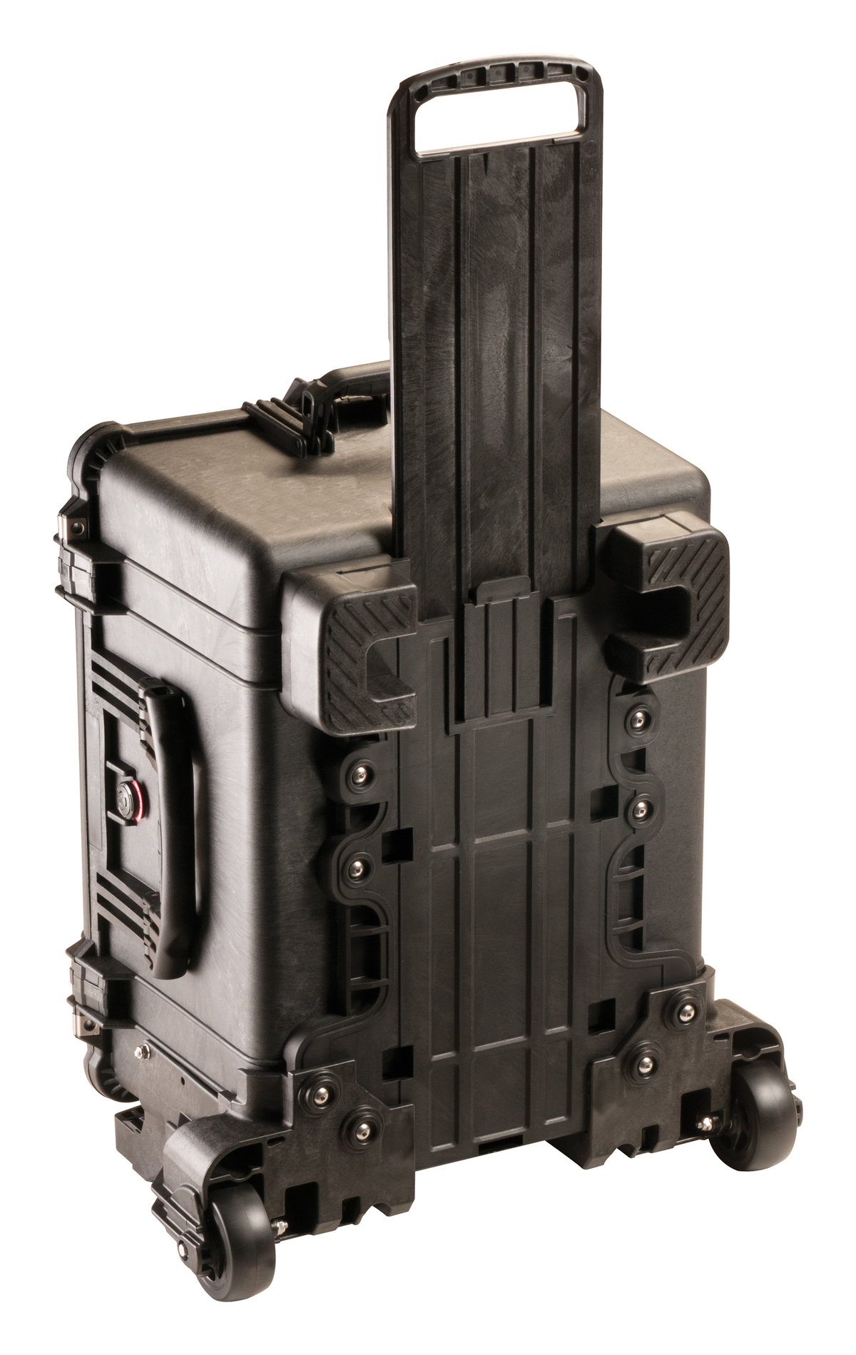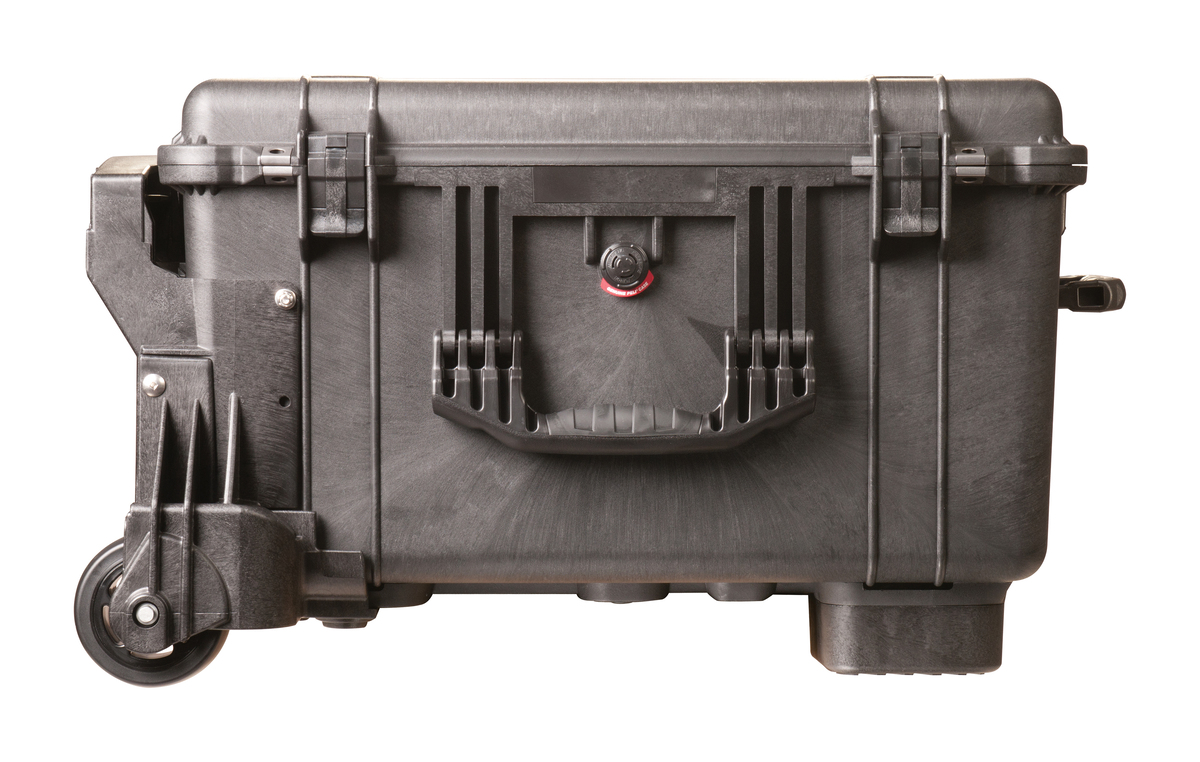 It is made of Ultra High Impact structural copolymer that makes it strong and durable. It features an exclusive 6.4mm neoprene o-ring and ABS latches to seal perfectly. It also includes an automatic purge valve for quick equalisation after changes in atmospheric pressure (essential for air travel). This Peli 1620M is equipped with 4" diameter x 1.5" wide (10.2 x 3.8cm) heavy duty polyurethane wheels with stainless steel bearings (up from 2inch/5cm hard rubber transport wheels on the standard 1620). It also features a retractable extension handle and multiple fold down carrying handles.