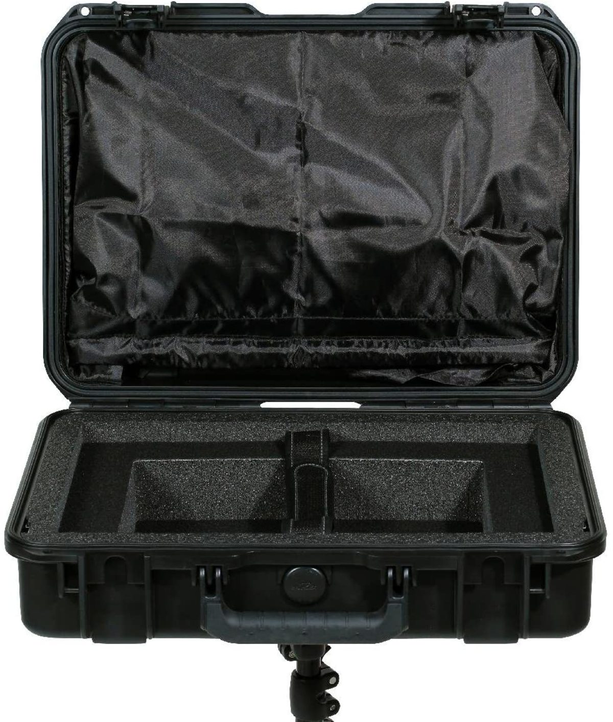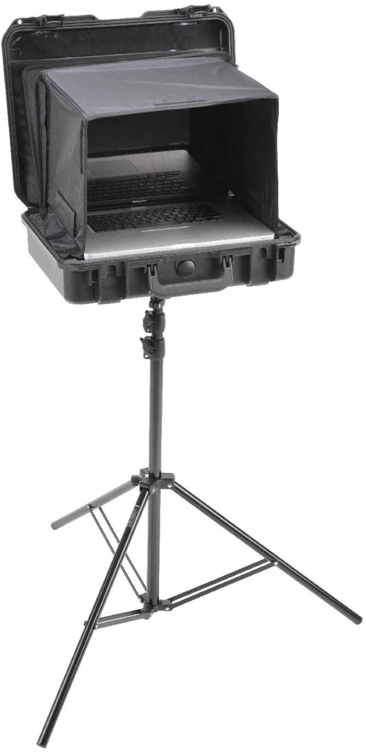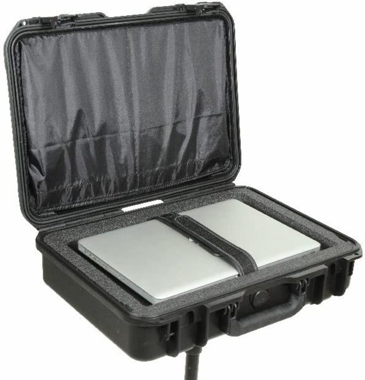 SKB has expanded their military-standard waterproof hard cases with custom interiors to accommodate the ever growing pro av market. The 3i-18135SNSC laptop case includes a sun screen that stores in the lid and up to a 17" laptop in the base. An accessory compartment is located under the laptop which is ideal for a power supply or an external hard drive. The suncreen includes a collapsible frame for secure storage. The bottom of the case features a built in 3/8" female thread which is reinforced by a heavy duty metal plate. Any light stand, tripod, or mic stand will work to support the case as long as it has or is adapted to a 3/8" male mount and can handle the weight of the laptop, case, and other accessories.These custom waterproof camera and video cases are backed by SKB's unsurpassed no-fault Lifetime Warranty.About our iSeries SKB's iSeries injection molded waterproof cases are constructed of ultra high-strength polypropylene copolymer resin and feature a gasketed, waterproof and airtight, submersible design (IP67) that is resistant to corrosion and impact damage. Its continuous molded-in hinge, patented "trigger release" latch system, comfortable, snap-down rubber over-molded cushion grip handle, secure stacking, and automatic ambient pressure equalization valve (MIL-STD-648C) all contribute to its military grade design.