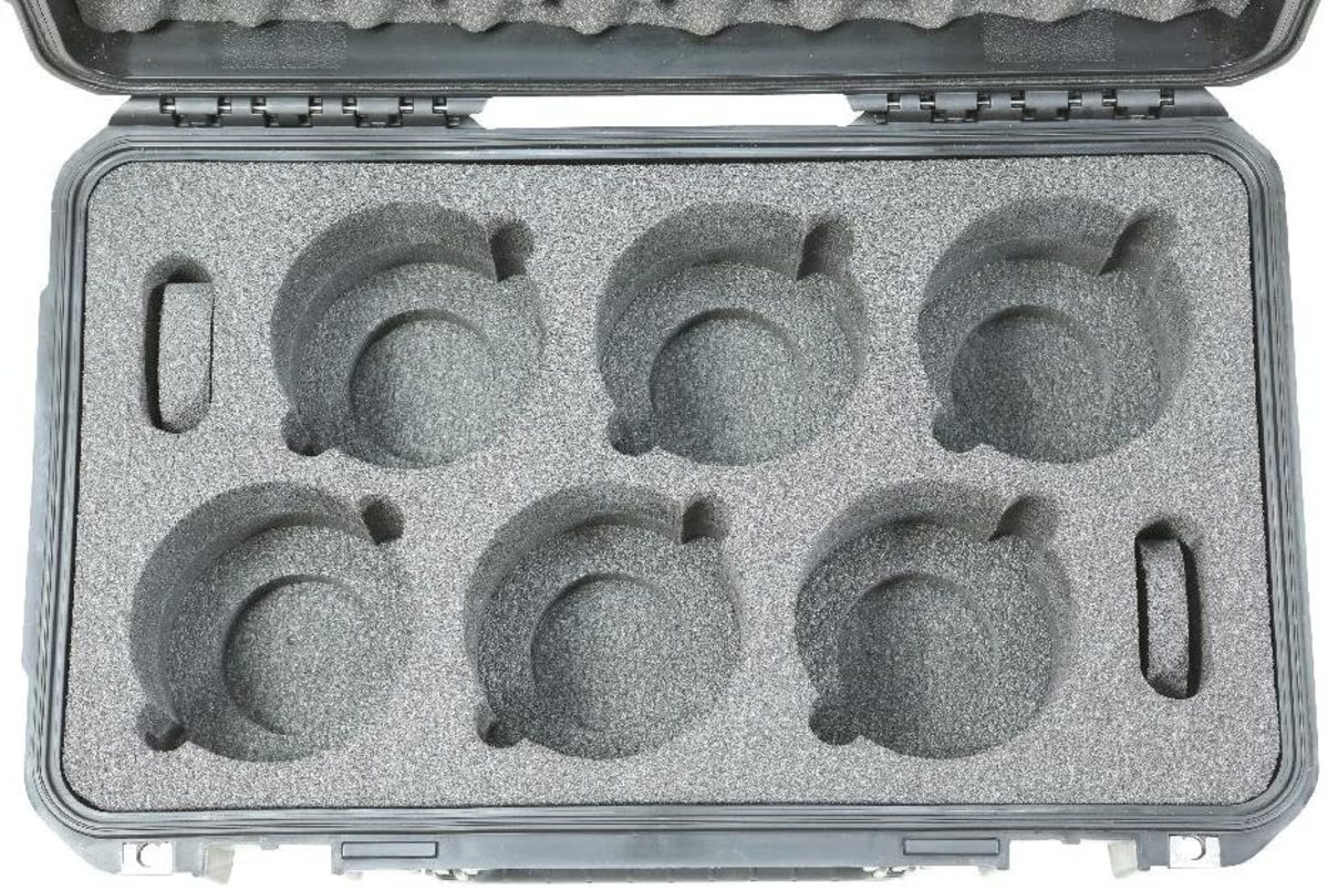 The iSeries 20118LENS Case (3i-20118LENS) case is the perfect companion case for the professional photographer. This case will hold six lenses such as the Canon Cinema Prime Lenses or Schneider Kreunznach Xenon FF Prime Lenses. Each lens slot has a diameter of 125mm and the base depth of each lens slot is a total of 120mm. The useable lid depth is 35mm creating a maximum length of 125mm per lens. There are two removable foam discs provided to change the internal base lens height to 97mm instead of the 120mm when needed. This case is the maximum approved size for airline carry on travel.This iSeries Lens Case, (3i-20118LENS) has trigger release latches for quick but secure access. This custom waterproof case is made in the USA and is backed by SKB's Unconditional Lifetime Warranty.About our iSeries SKB's iSeries injection molded waterproof cases are constructed of ultra high-strength polypropylene copolymer resin and feature a gasketed, waterproof, submersible design (IP67) that is resistant to corrosion and impact damage. Its continuous molded-in hinge, patented "trigger release" latch system, comfortable, snap-down rubber over-molded cushion grip handle, secure stacking, and automatic ambient pressure equalization valve (MIL-STD-648C) all contribute to its military grade design