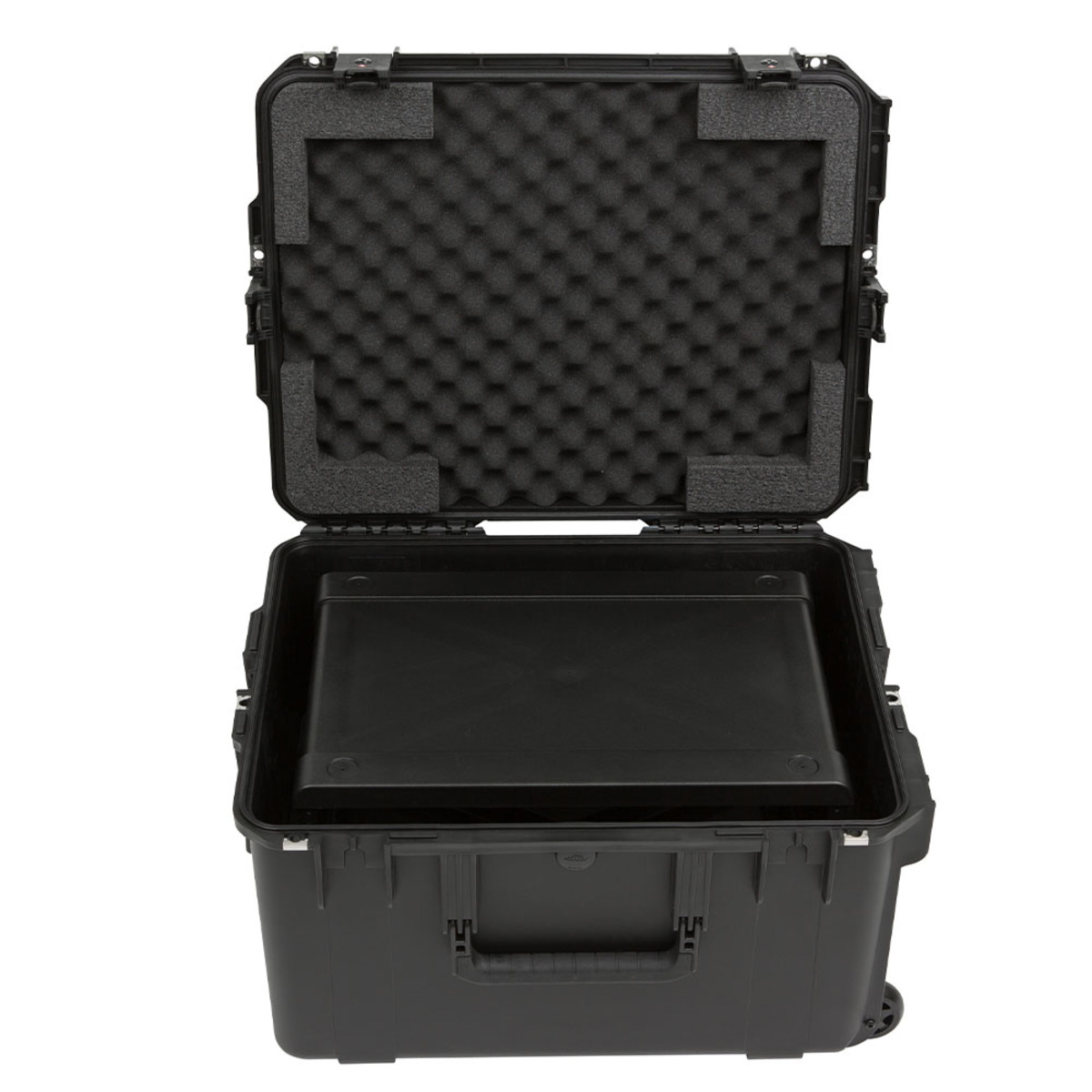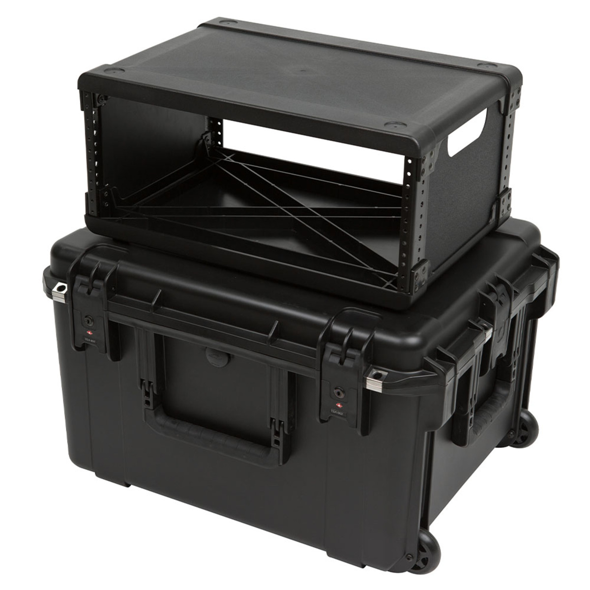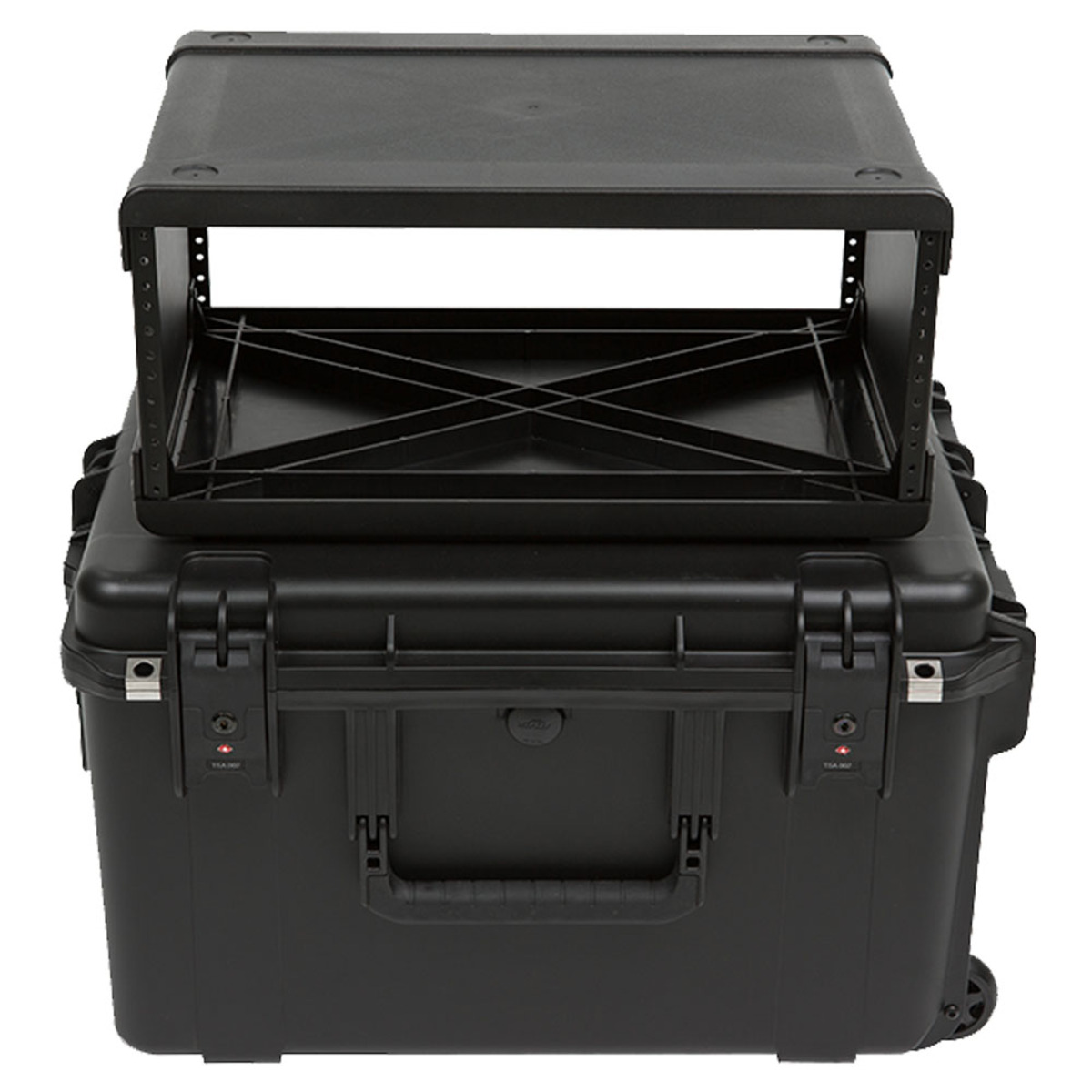 The 3i-2217M124U 4U Fly Rack at less than half the weight of standard shock racks, SKB Fly Racks feature iSeries Watertight injection molded cases that are under 62 linear inches to keep from being oversized—the perfect solution for flying or shipping delicate equipment. Convenient in-line wheels and a push button release pull handle provides easy transport.