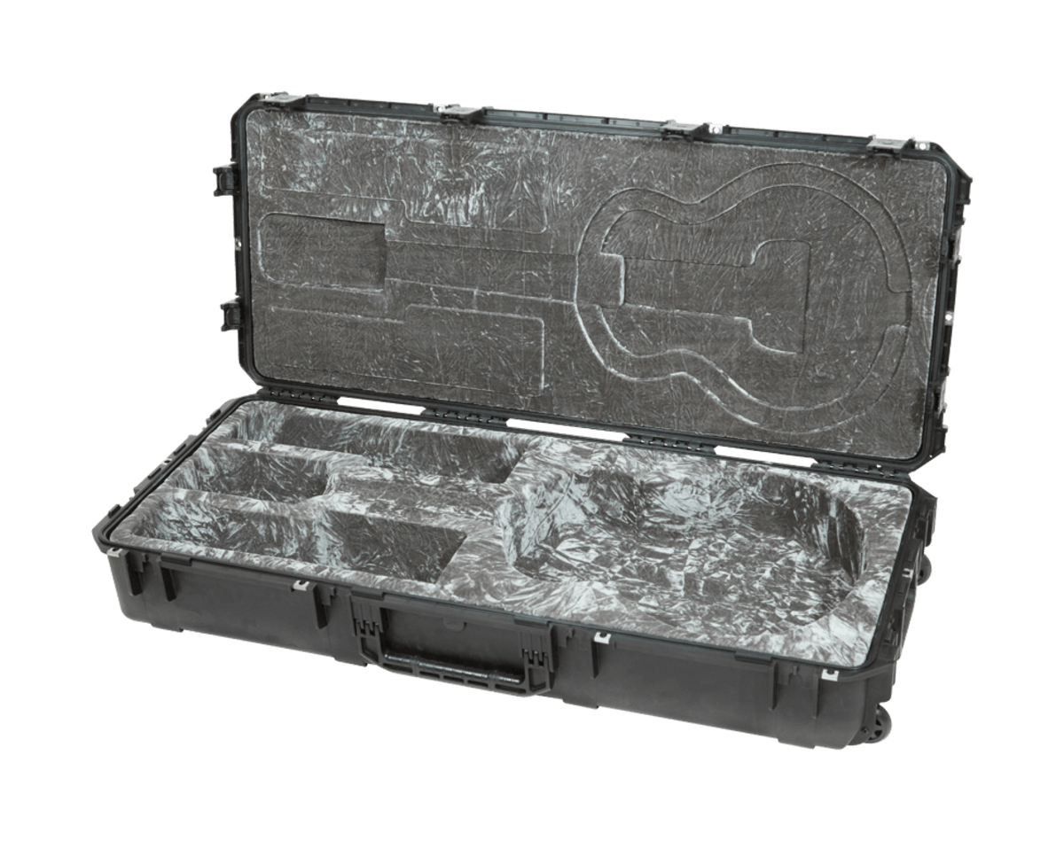 The iSeries 4719-20 Jumbo Acoustic guitar case accommodates popular Jumbo shaped guitars. The molded EPS interior features a plush lining with SKB's signature platinum plush and keeps the instrument secure in transport. The exterior is molded of ultra-high strength polypropylene copolymer resin and is water and dust proof due to the integrated rubber gasket in the lid. The case includes inline wheels, eight patented trigger latches, two with TSA locks and three injection molded handles.