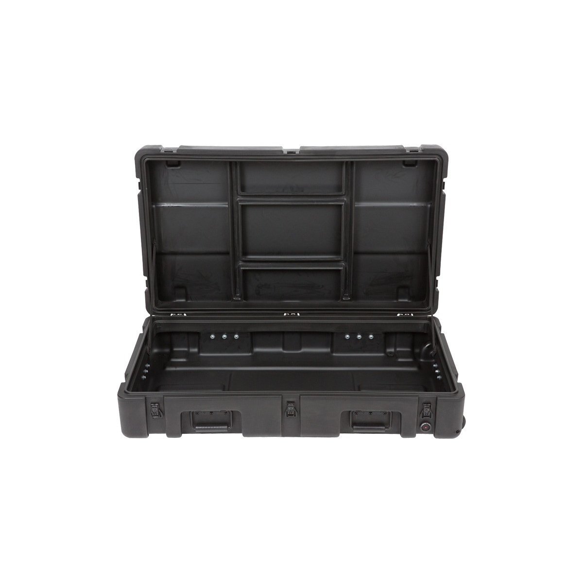 The 3R3821-7 Roto Molded Waterproof Utility Case is the "big brother" to our 3R3221-7, and includes convenient 2" wide edge wheels for easy transport.These Mil-Standard cases were designed to meet the most demanding military specifications. They are roto-molded for strength and durability, airtight and water proof with solid stainless steel latches and hinges that will withstand the most demanding shipping conditions.The 3R Mil-Std. Cases are molded of (LLDPE) polyethylene impact resistant / UV stabilized material and meet or exceed MIL-STD 810 and MIL-C-4150J specifications.The shipping cases are all available with an empty interior while some models are available with: cubed foam, layered foam, padded dividers, and a pull handle with wheels.Wheel options vary by case.