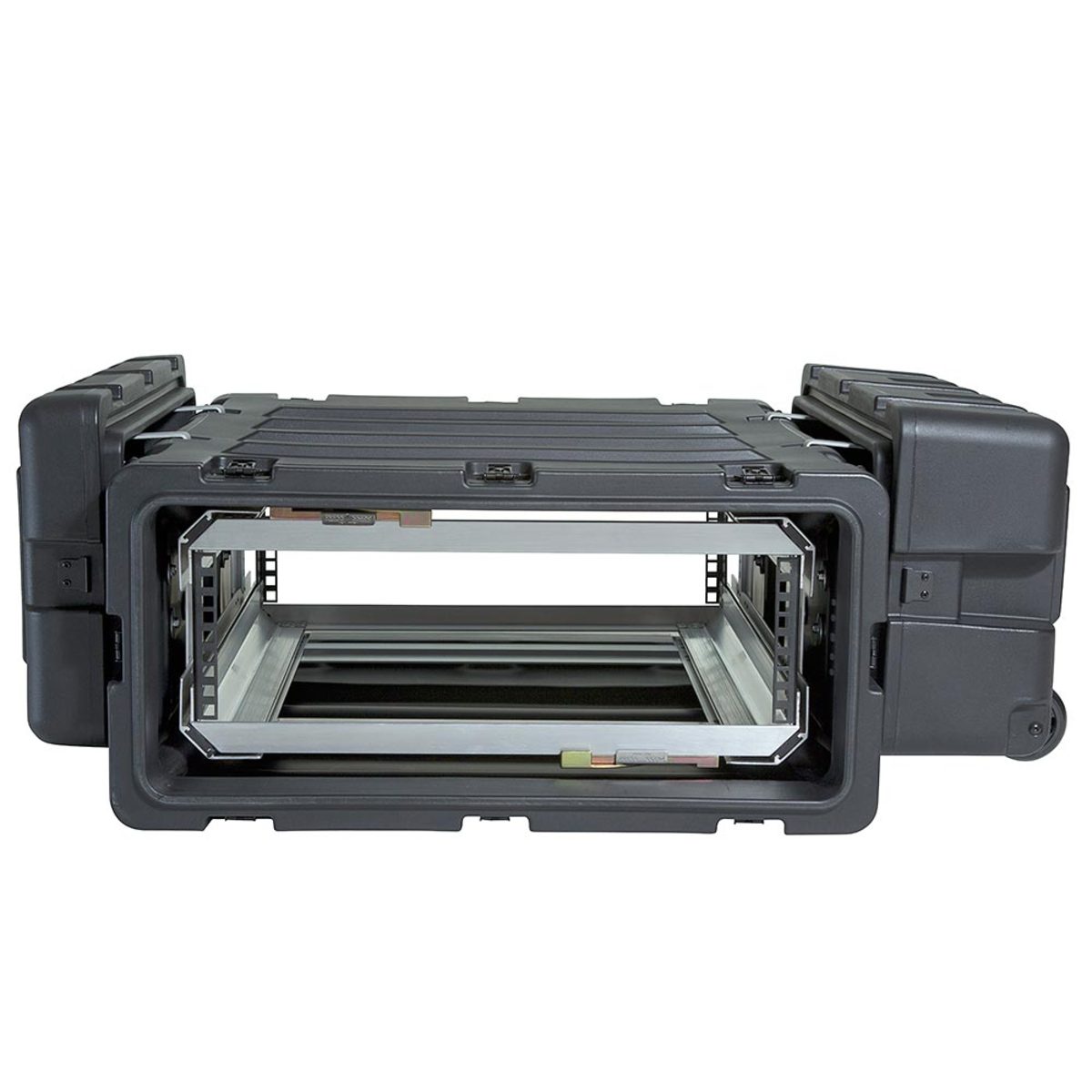 The interior of the case features a removable rack with a patent pending “positive lock” latching system that slides open like a file drawer, allowing full access to racked equipment. The interior rack is also completely removable allowing complete frame access for bench integration.
