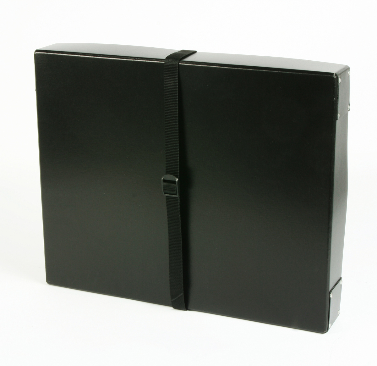 The Print Box is a One piece raw edged box & lid, manufactured in black resin fibreboard, straight side, flush base, lid retained by 1 strap with a plastic buckle, strap riveted to box base and buckle position to lid centre.